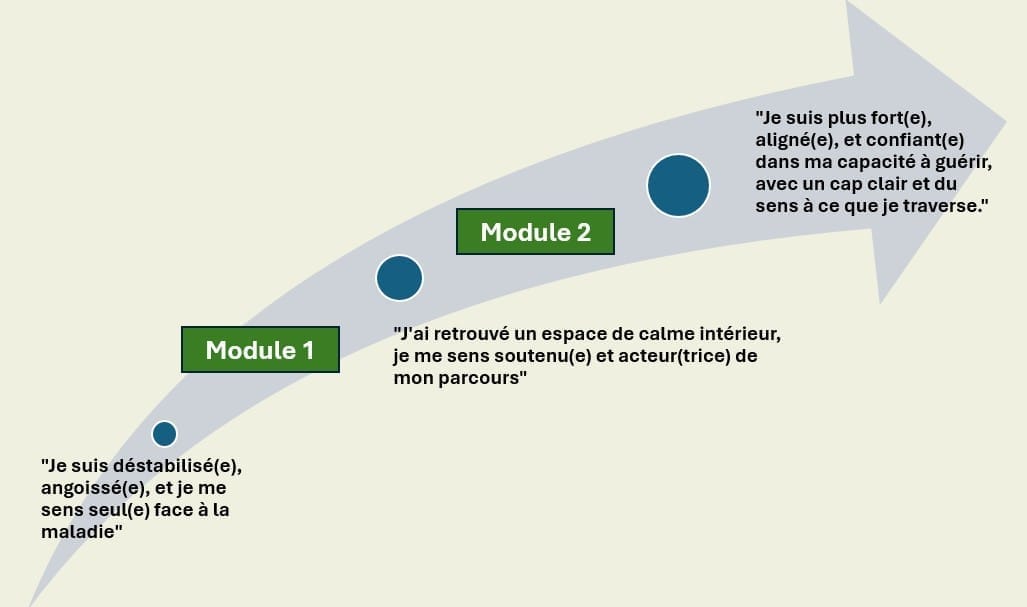 Le premier module vous aide à aller mieux et à retrouver vos appuis intérieurs : sérénité, confiance, pouvoir d’agir. Il permet aussi de créer les conditions les plus favorables à la guérison, en activant les trois leviers essentiels : votre participation active, un cercle de soutien solide, et l’intégration des premiers soins complémentaires.